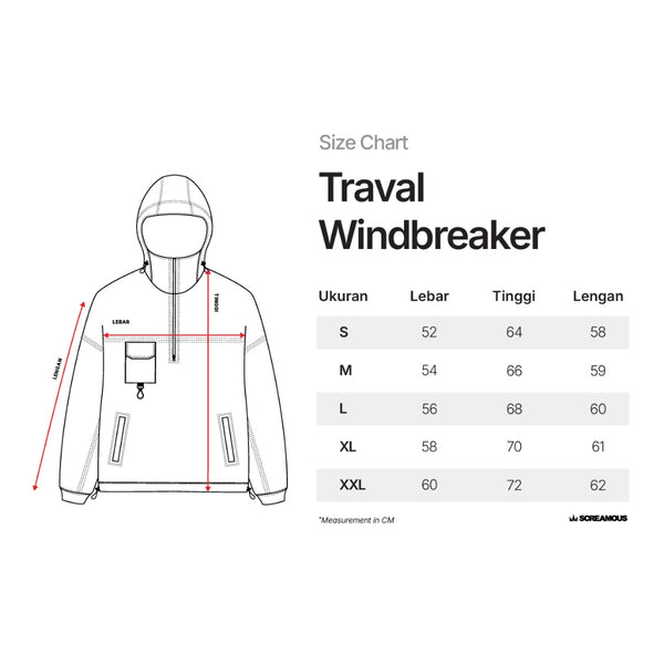 SCREAMOUS TRAVAL Adalah WindBreaker Jaket Pria dan wanita yang dibuat dari bahan Premium Polyester Crinkle bekualitas tinggi dibalut dengan variasi contrast stitchs dengan lapisan water-repellent untuk perlindungan di berbagai cuaca. Terdapat kompartemen tiga saku dibagian depan dilengkapi dengan half zipper type Vislon dan satu saku dibagian dalam (hidden pocket) juga terdapat Rubber Patch Logotype Screamous pada bagian lengan. Nyaman digunakan untuk aktivitas sehari hari.